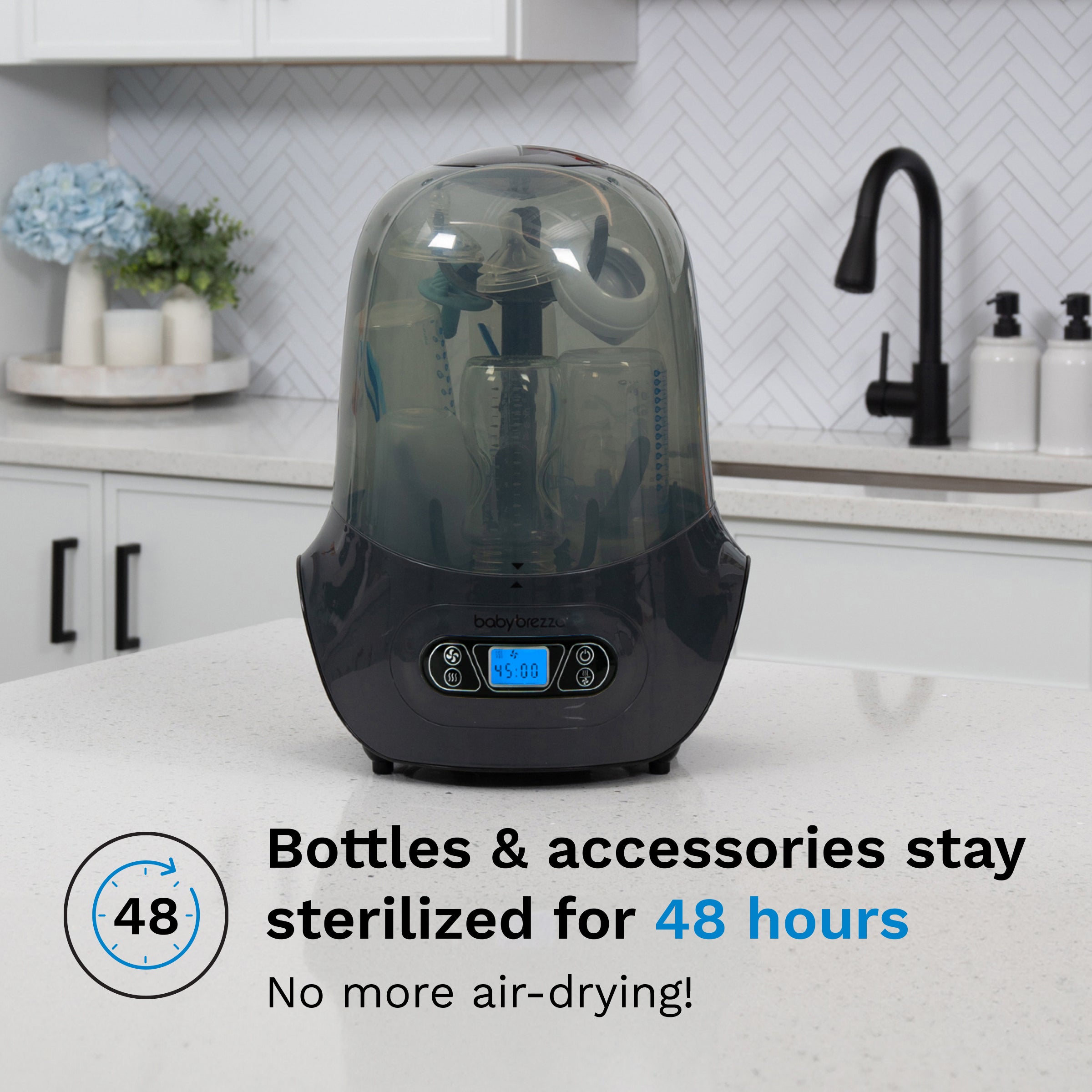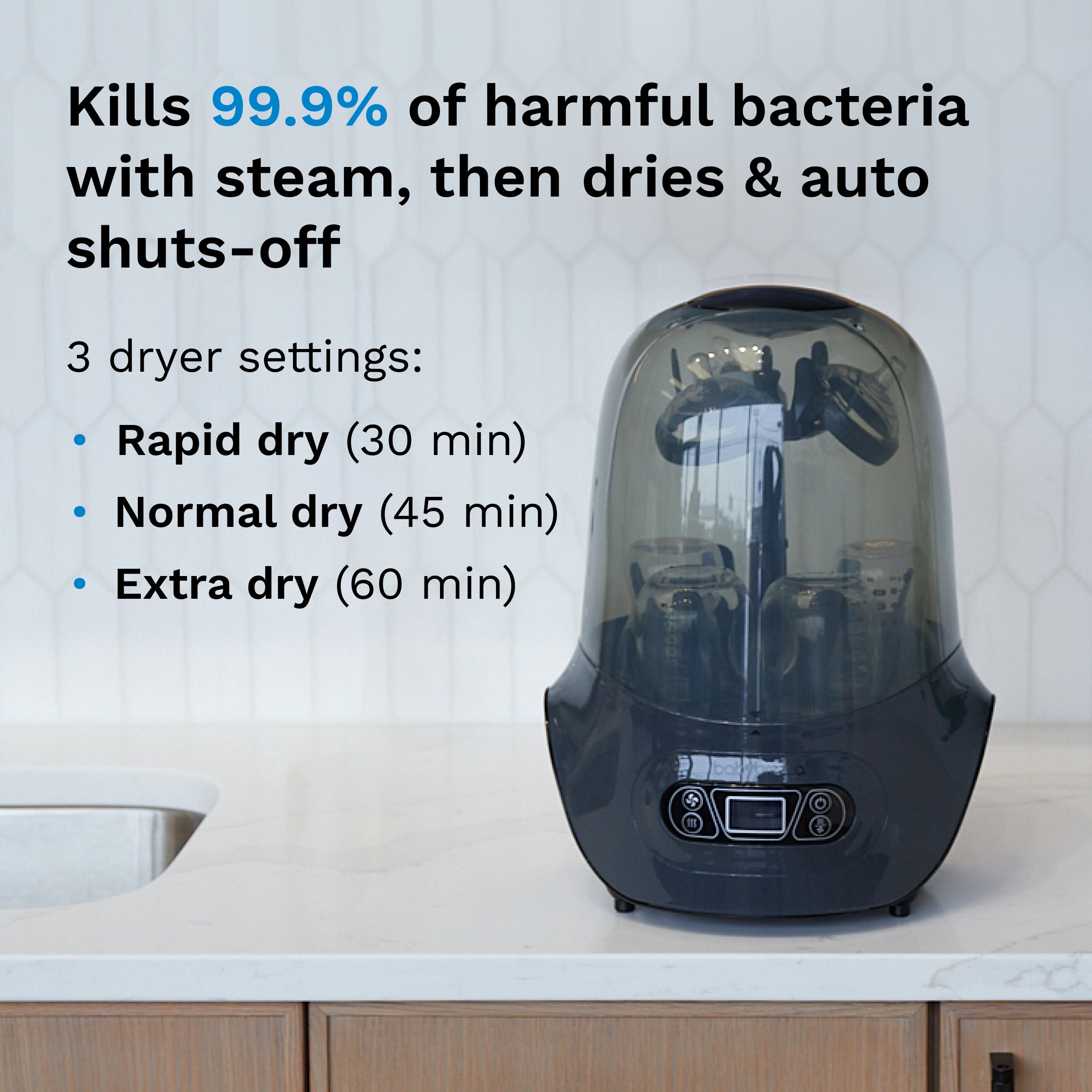 • Faster. safe. more hygienic – Saves water and time compared to traditional sterilization methods like boiling or dishwashers
