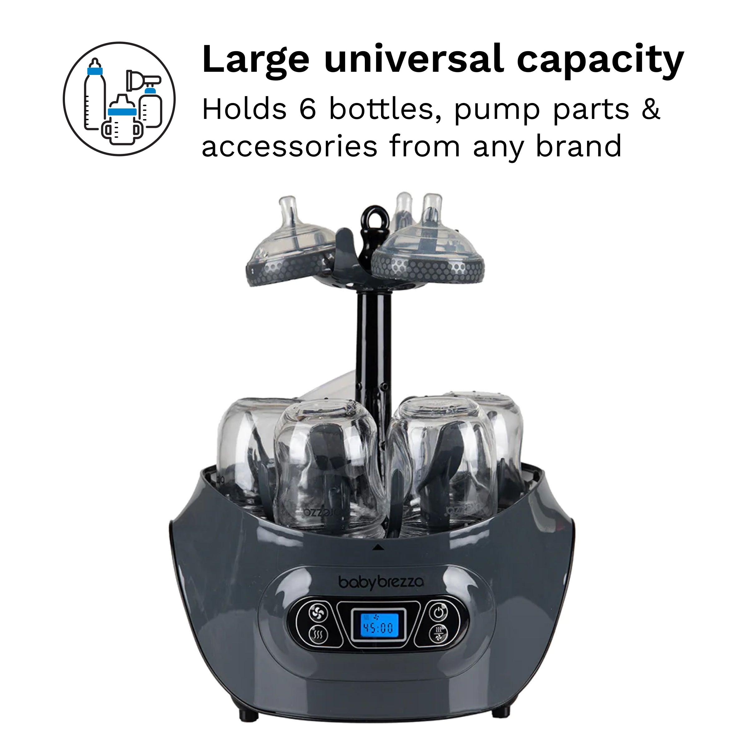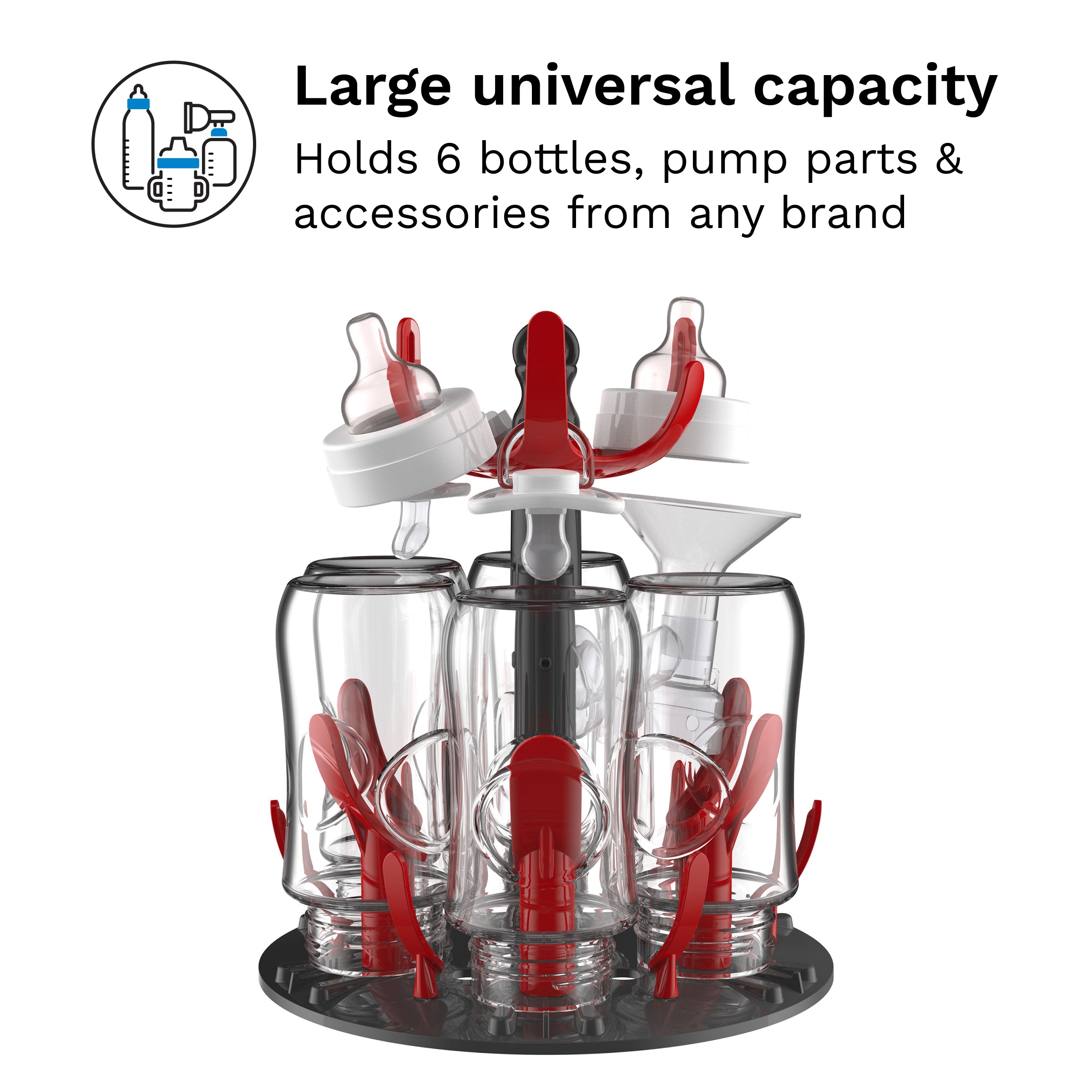 • Large capacity – Holds 6 narrow or wide neck bottles (glass. plastic or silicone). breast pump parts (including wearables). pacifiers. teethers. sippy cups. and other accessories from any brand