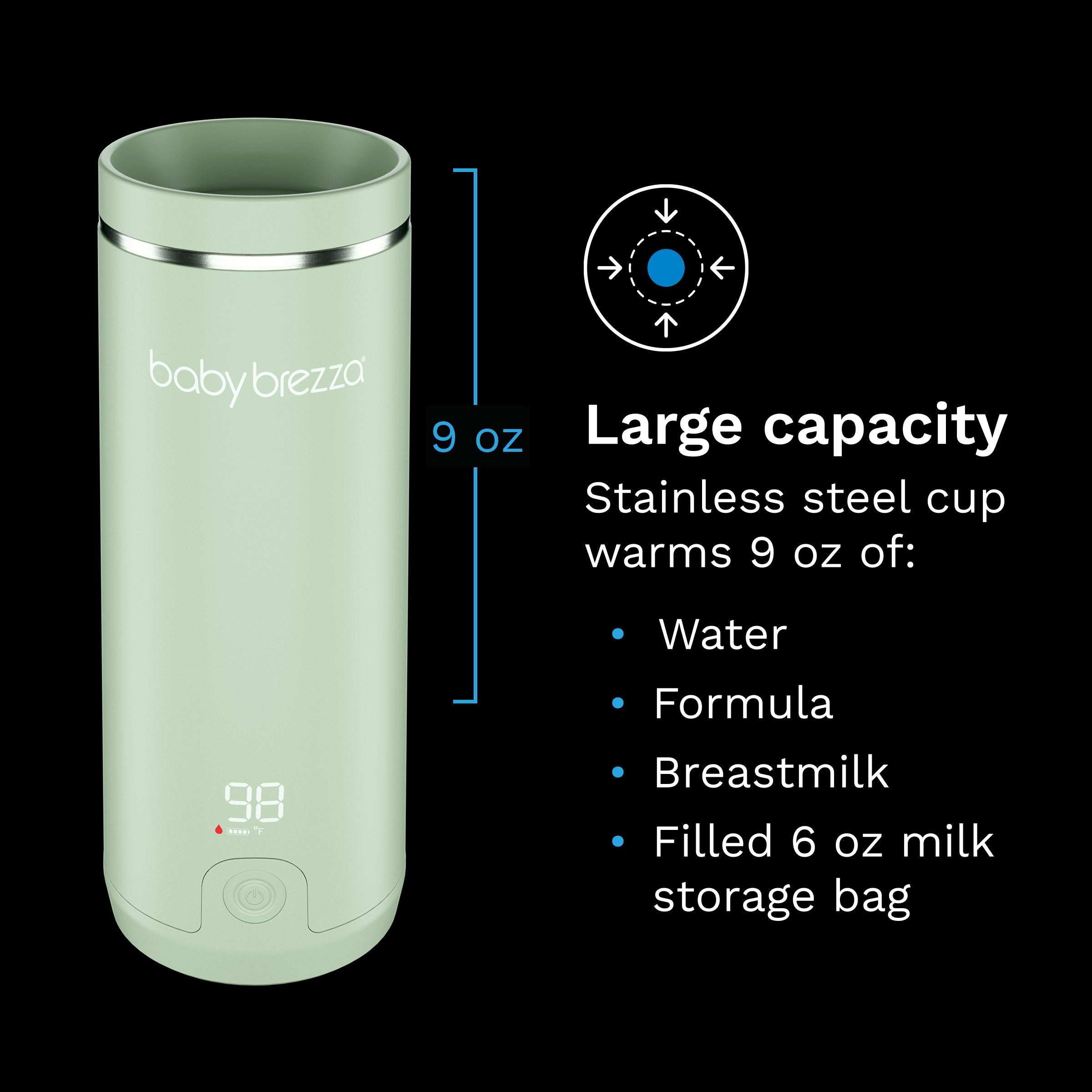 • Large capacity and slim design – Stainless steel cup holds 9 oz of water. formula. or breastmilk. or a 6oz milk storage bag; fits in cupholders. bottle pockets. diaper bags. cars. and strollers (3W x 3D x 8.3H)